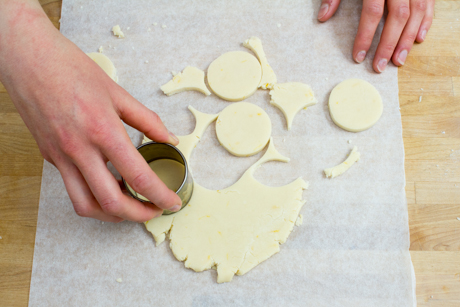 5. Cut out cookies using a round cutter, then re-roll scraps and cut out again. If the dough gets too soft, just re-wrap it and chill it for about 15 minutes. Place cookies 1 inch apart on prepared baking sheets and bake until barely beginning to brown, 12 – 15 minutes. Transfer to wire racks to cool completely.