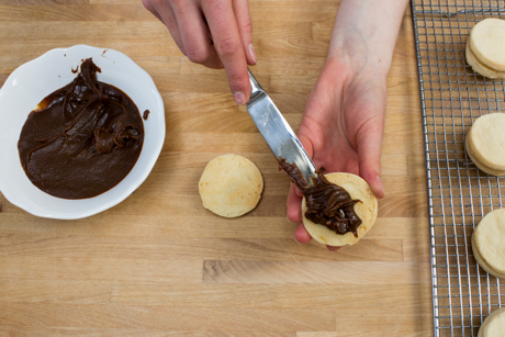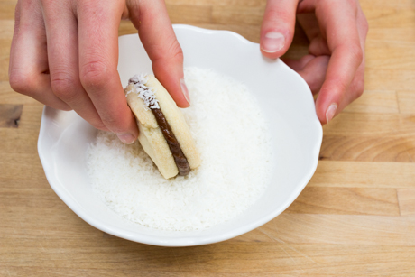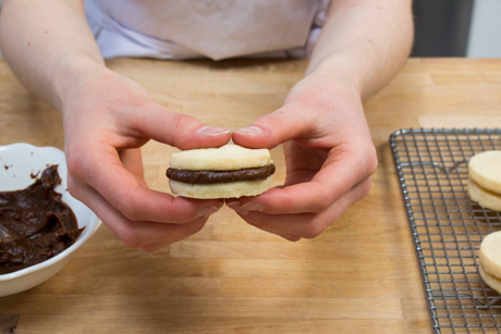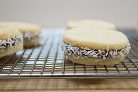 6. Form sandwiches: Place about 1 teaspoon of dulce de leche between two cookies, squeezing them together gently. Roll in shredded coconut if you so desire.
