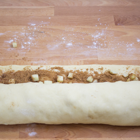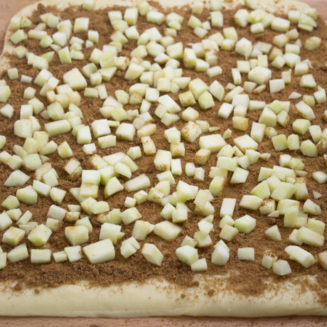 Roll the dough into a rectangle 18- x 12-inches (45- x 30-centimetres). Align dough so the shorter side is closest to you. Spread with butter, leaving a ½ inch (1 centimetre) border along the shorter sides. Sprinkle butter evenly with the sugar mixture, followed by the apple.