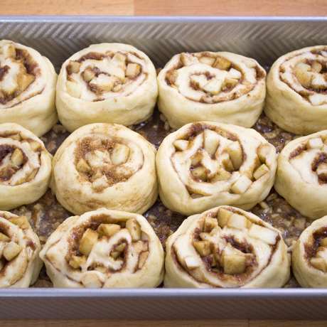 Roll the dough away from you, pinching the end seam to seal. Slice the roll into 12 even buns. Arrange buns cut side up on top of the caramel and walnuts. Cover pan loosely with plastic wrap and allow buns to rise until doubled, about an hour.
