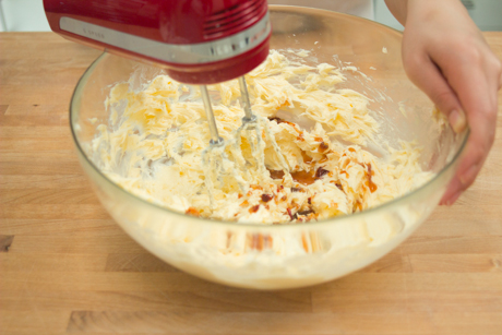3. To the butter, add approximately 1 tablespoon of the wet ingredients, and begin mixing on low, moving the beaters around until the liquid starts to emulsify into the butter.
