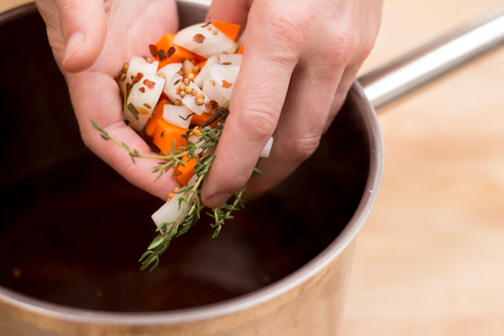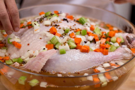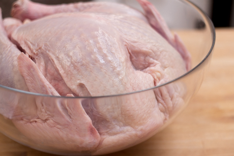 3. Find a large bowl or pot that will fit your turkey. Place the turkey into the bowl or pot, then pour the brine over top. Add more water as needed to the pot, until the turkey is covered completely. Place a plate on top of the turkey to keep it submerged in the brine. Let turkey soak in the brine overnight in the fridge, at least 6 hours.