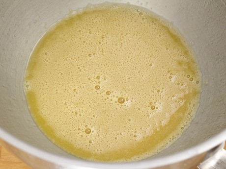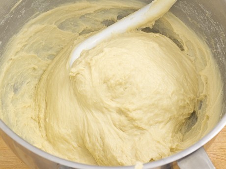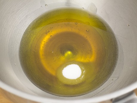 2. Place the remaining sugar, olive oil and salt in the bowl of a stand mixer fitted with the paddle attachment; mix on medium low to combine. Add eggs and yolks one at a time, allowing each to incorporate before adding the next. Add yeast mixture and mix for 30 seconds.