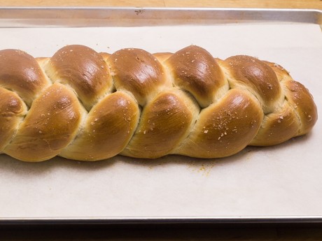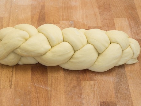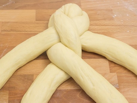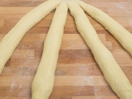 7. Roll each piece into an even rope 18 inches (46 cm) long; firmly pinch each rope together at one end. Number the ropes, in your mind, from 1 through 4 (from left to right). Bring rope 4 over rope 2, then rope 1 over 3 and finally rope 2 over 3. Each time you move one rope over another, the strands should be renumbered from 1 through 4 (again, from left to right). Repeat moving rope 4 over 2, rope 1 over 3 and rope 2 over 3 until all the dough is fully braided. Pinch the ends closed and tuck them under the loaf. Place on a baking sheet and lightly cover with plastic wrap. Allow to rise, until soft and puffy, taking about 45 minutes.