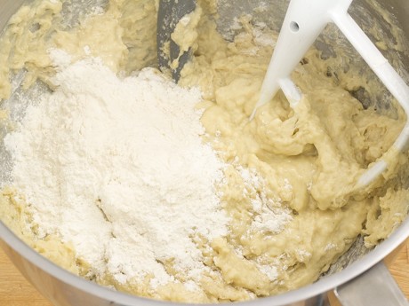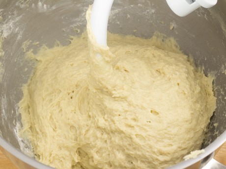 3. Reduce mixer speed to low and add the flour 1 cup at a time. Once all the flour has been added, mix for 2 minutes. Switch to the hook attachment and mix on medium speed for 6 minutes. When ready, dough will be elastic and slightly sticky.