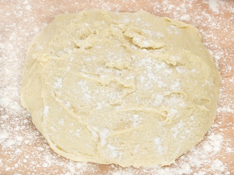 5. Scrape dough back onto a floured surface and pat into a rough circle about 1 inch (2.5 cm) thick. Pull one side of the dough and fold it over the centre. Brush off any excess flour and pull the opposite side and fold it over the first fold, like folding a letter. Turn the dough 90 ° and repeat the folding process on the other sides. Place back in bowl, re-cover, and allow it to rise for 30 minutes.