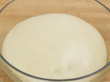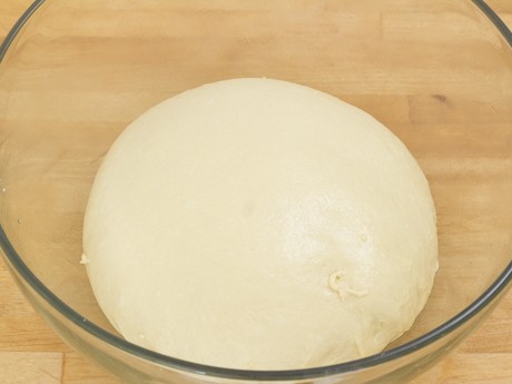 4. Scrape dough onto a lightly floured surface and gently gather up into a ball, and using cupped hands, continuously pull the dough out from underneath itself. Place in a large greased bowl, cover with plastic wrap and allow to rise until doubled, about 1 hour and 15 minutes.