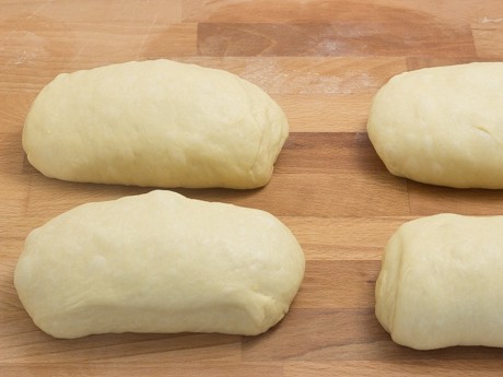 6. Divide dough into four equal portions (about 310 g each) and shape each piece into a rough log about 5 inches (13 cm) long. Cover with plastic wrap and allow it to rest for 10 minutes.