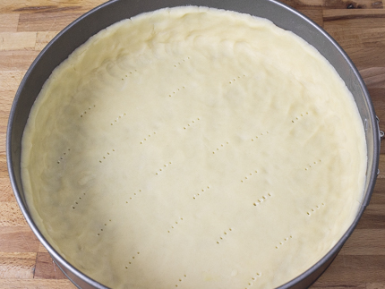Roll the dough into a 11 inch (28 centimetre) round and ease into the bottom of the prepared pan. Press dough 1 inch (2.5 centimetre) up the sides of the pan. If dough tears, press gently back together.