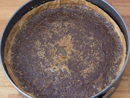 Pour the filling into the parbaked crust and fold a strip of aluminum foil over the edge of the pan so that the exposed edge of the crust is protected from over browning. Bake until filling has a slight crust on top and bubbles gently; 35 to 40 minutes.