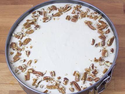 Pour the filling over the cooled butter tart filling and decorate with chopped pecans, if desired.