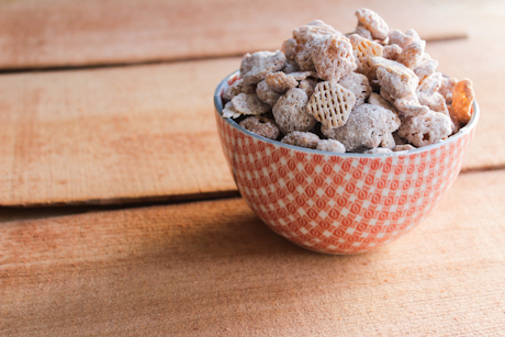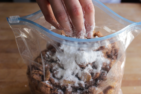 4. Place the coated cereal into a large re-sealable plastic bag. Add the icing sugar to the bag, seal it, then shake the bag until all the cereal is evenly coated with icing sugar. Place in bowls and serve to the fans.