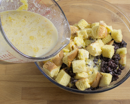 Whisk together milk, Redpath® Dark Brown Sugar, melted butter, eggs, orange juice, orange zest, and vanilla. Pour over bread and mix well.