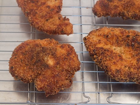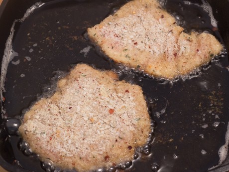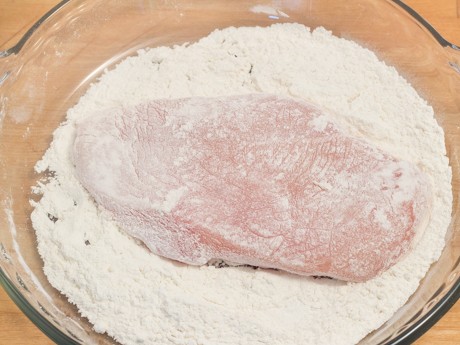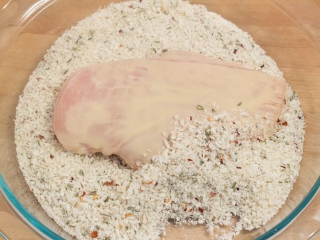 4. Dredge the chicken in the flour to coat, followed by the buttermilk mixture. Place in the panko crumbs, gently pressing enough to adhere the crumbs to both sides. Repeat with remaining chicken breasts.