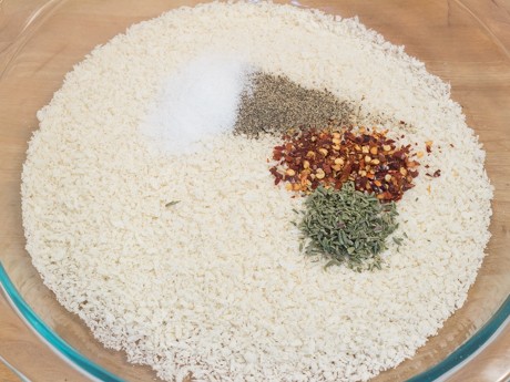 3. In a third dish, mix together the panko bread crumbs, salt, black pepper and chili flakes.