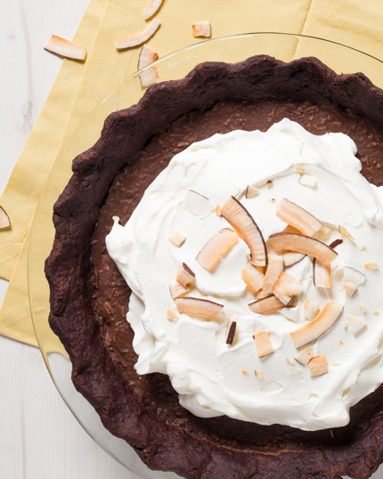 Chocolate Coconut Cream Pie Chocolate Coconut Cream Pie The more coconut we have in our lives, the happier our baking escapades become. We love the flavour of coconut, especially with how easily it blends into a cream pie. The tropical flavours are an absolute dream to work with, and who doesn’t love some toasted coconut on top for a good crunch? Try this recipe tonight, and unlock the amazing flavour of coconut in your baking. Categories: Pies & Tarts Desserts Yields 1 9 inch (23 centimetre) pie/ 8 - 10 servings Prep Time 1 hour Cook Time 40 minutes; Chilling Time: 4 hours 15 minutes Ingredients For the crust: 1 ¼ cup (156 g) all-purpose flour ½ cup (61 g) cocoa 1 tbsp (12 g) Redpath® Granulated Sugar ½ tsp (3 g) salt ½ cup (113 g) unsalted butter, cut into ½ in (1 cm) pieces and chilled 3 to 4 tbsp (45 to 50 ml) ice water For the filling: 1 cup (85 g) shredded unsweetened coconut ¼ + ⅓ cup (50 g + 66 g) Redpath® Granulated Sugar 2 ½ cups (600 ml) full fat coconut milk 3 tbsp (24 g) cornstarch ½ tsp (3 g) salt 3 large egg yolks 1 large egg 6 oz / 170 g bittersweet chocolate, chopped (about 1 cup) 1 tsp (5 ml) vanilla extract 1 ¼ cup (240 ml) heavy (35%) cream ¼ cup (30 g) Redpath® Icing Sugar ½ tsp (2.5 ml) coconut extract large toasted coconut flakes, to garnish Icing Sugar Instructions For the crust: Whisk together the flour, cocoa, Redpath® Granulated Sugar and salt in a large bowl. Add the butter. Using a pastry blender, or two butter knives, cut in the butter until it resembles coarse crumbs (with a few pea-sized pieces). Add the water, one spoonful at a time, until the dough starts to come together, adding the fourth tablespoon (15 millilitres) of water, if necessary. Gather dough into a ball and knead a couple of times to bring together. Flatten into a disc, wrap in plastic and chill; 30 minutes. On a surface lightly dusted with cocoa, roll pie dough into a 14 inch (26 centimetre) circle. Transfer the dough to a 9 inch (23 centimetre) pie dish, and gently press into the dish. Trim overhanging dough so that ½ inch (1 centimetre) remains outside the pie dish. Fold under the overhanging dough and flute the edges (take a look here to see how it’s done). Prick the crust, all over, with a fork. Place pie crust in the freezer for 15 minutes. Preheat oven to 375°F (190°C) and set a rack in the lower third of the oven. Line the chilled crust with foil or parchment paper and fill with pie weights, beans or rice. Bake crust for 20 minutes. Remove weights and foil (or paper); return crust to oven for 20 minutes, until it’s dry to the touch. Cool crust completely before filling. For the filling: Reduce oven to 325°F (165°C). Place coconut on a baking sheet and bake; 5 minutes. Stir and bake until golden; about 3 minutes. Set aside to cool. In a large bowl, whisk together ⅓ cup (66 grams) of Redpath® Granulated Sugar, cornstarch and salt. Add the egg yolks, egg and whisk until smooth. Place the coconut milk and the remaining ¼ cup (50 grams) of Redpath® Granulated Sugar in a medium-sized saucepan. Set over medium heat and bring to a simmer. Whisking continuously, slowly add the hot coconut milk to the egg yolk mixture. Once all the milk is incorporated, pour the custard back into the pot. Stir over medium heat until the mixture boils and thickens; 4 to 5 minutes. Add the vanilla and chopped chocolate to the custard and stir until smooth. Fold in the toasted coconut. Cool filling at room temperature; 30 minutes. Pour into the cooled crust and chill for a minimum of 3 hours, or up to overnight. After 3 hours, cover pie with plastic wrap (if pie is wrapped earlier, condensation may form and drip on the surface of the chocolate filling). Prior to serving, pour the chilled cream into a large bowl. Whip with an electric mixer on medium until soft peaks form. Add the Redpath® Icing Sugar and coconut extract and continue beating until stiff peaks form. Spread the whipped cream over the chilled pie. Garnish with toasted coconut flakes and serve. CHEF'S TIPS To easily slice the pie, fill a container the depth of a sharp chef’s knife with hot water. Warm the knife in the water and dry with a clean kitchen towel. Slice pie, rinsing and drying the knife in between each slice. More Pies & Tarts Recipes Pumpkin Pie No-Bake Vegan Chai Chocolate Tart Classic or Lattice-Topped Apple Pie Butter Tarts Blueberry pie Tarte au Sucre Banoffee Pielets Pumpkin Mousse Tart with Spiderweb Ghost Tarts with Sweet Orange Brown Sugar Filling Summer Blueberry Crisp