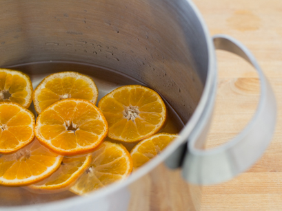 7. After 40 minutes, take the pot off heat and allow to cool to room temperature with the clementines still submerged in the simple syrup.