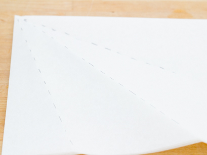 3. Take a square or rectangle piece of parchment paper. Fold once lengthwise and then again along the width. Make a triangular shape, fold again at a 45 degree angle and once again to make the shape shown below.