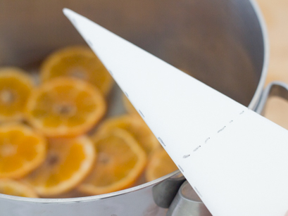 2. Take pot off heat and allow to cool to room temperature. Add sliced clementines, allow to slightly overlap on each other.