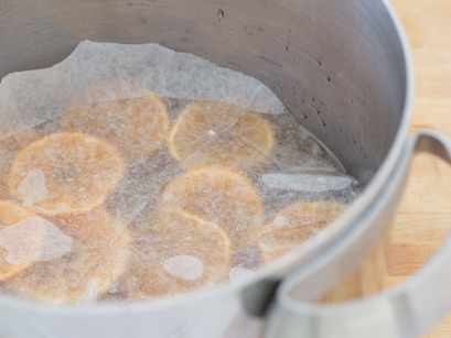 5. Place parchment circle on top of the citrus fruits and use a small pot lid or an oven proof plate plate to submerge the fruit into the syrup as it cooks.