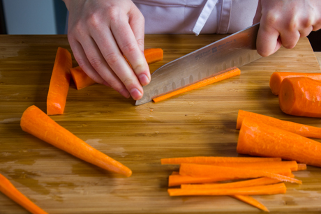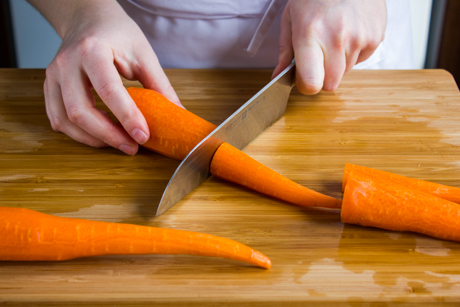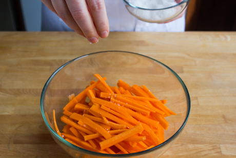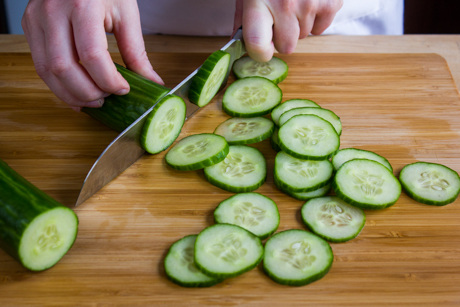Wash and prepare all of your vegetables, then place each vegetable in its own shallow dish or bowl. Slice the cucumber into thin rounds, julienne the carrots (cut them into thin sticks), and thinly slice the napa cabbage.
