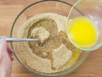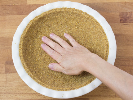 Add the melted butter and mix until the crumbs are coated. Set aside 2 tablespoons (34 g) of graham cracker mix. Transfer the remaining mixture into the pie dish. Firmly and evenly press crumbs into the bottom and sides of the dish.
