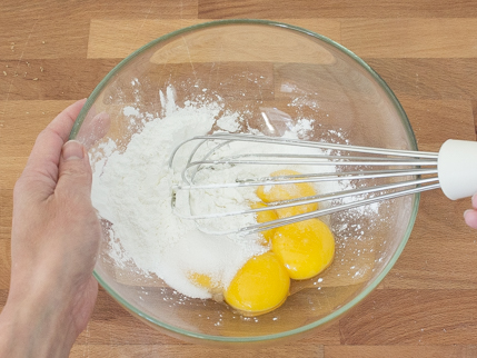 In a bowl, whisk together yolks, remaining sugar, cornstarch, and salt until well combined.
