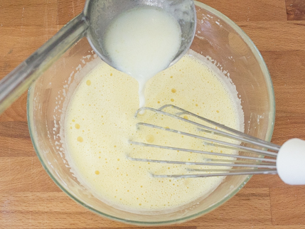 Temper yolks by ladling a small amount of hot milk into the eggs while continuously whisking.