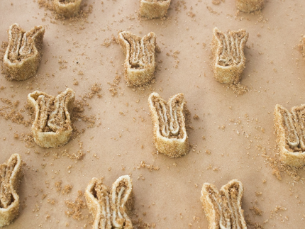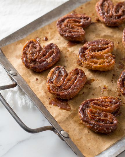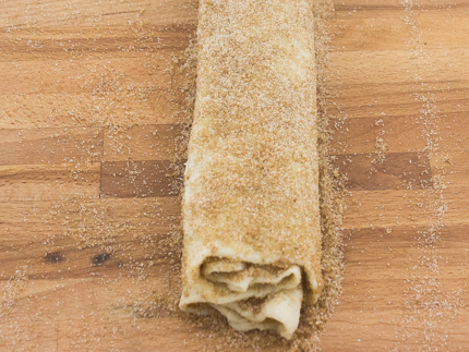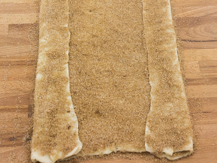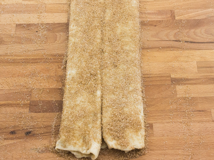 Spread half of the sugar mixture onto the work surface. Lightly brush the top of the puff pastry with the melted butter. Place the buttered side of the rolled out puff pastry onto the sugar-spice mixture. With a rolling pin, lightly roll the pastry onto the sugar mixture, this will coat and embed the underside with the sugar and spices.