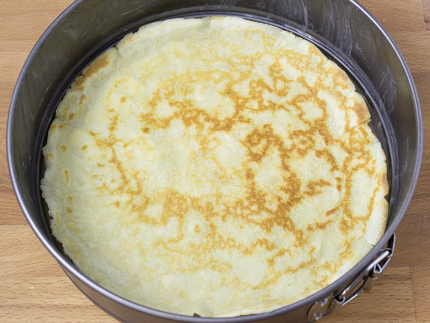 If desired, set broiler to high and broil the crêpe cake for 2 minutes to brown cheese. Remove and allow to rest 10 minutes before unmolding and slicing into wedges.