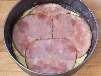 Layer a crêpe over the ham and spread with about ½ cup (120 milliliters) of the cheese sauce.