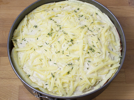 Beginning with the third crêpe, repeat layers until all crêpes are used. Sprinkle the reserved ½  cup (46 grams) of cheese and thyme leaves overtop.