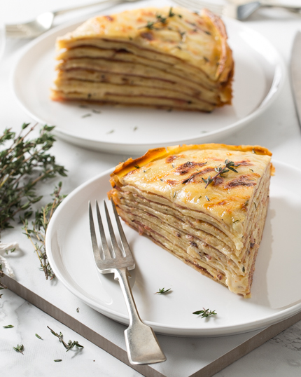 Glazed Ham and Cheese Crêpe Cake on a cake stand