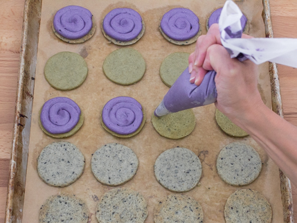 Halloween Sandwich Cookies with Ube Frosting Halloween Sandwich Cookies with Ube Frosting Halloween is a feast for all the senses, but these cookies are targeting your sight and taste. Kids and grown-ups alike will love the amazing colours of these cookies, and the incredible purple frosting! Best of all, the colourings are all natural, made from black sesame seeds, matcha tea, and ube. They’re so beautiful (and delicious), it’s scary! Categories: Cookies, Brownies & Bars Snacks Afternoon Tea Halloween Granulated Sugar Yields 32 sandwich cookies Prep Time 30 minutes Cook Time 8 to 10 minutes Ingredients For the cookies: 2 1/3 cups (292 g) all-purpose flour ½ tsp (3 g) salt ¼ tsp (1 g) baking powder ¾ cup (170 g) unsalted butter, room temperature 3/4 cup + 2 tbsp (175 g) Redpath® Granulated Sugar 1 large egg 2 tsp (10 ml) pure vanilla extract 4 tsp (6 g) matcha powder 2 tbsp (19 g) black sesame seeds, lightly toasted and ground 1 tbsp (9 g) black sesame seeds, lightly toasted For the Ube frosting: 3/4 cup (170 g) butter 2 2/3 cup (320 g) Redpath® Icing Sugar 3/4 tsp (5 g) salt 1 tbsp (15 ml) ube flavouring Instructions For the Cookies: Preheat oven to 350°F (177°C). Line two baking sheets with parchment paper. In a medium bowl, whisk together the flour, salt, and baking powder until well combined. Set aside. In the bowl of a stand mixer, with the paddle attachment, cream the butter with the Redpath® Granulated Sugar on medium speed until fluffy and pale in colour; about 3 minutes. Add the egg and vanilla extract. Blend until the egg and vanilla extract are fully incorporated into the batter. On low speed, add about half of the dry mixture to the bowl, until barely combined. Add the remaining flour. Mix until it just forms a dough; do not overmix. Divide dough in half. On one half of the dough, sprinkle the matcha green tea powder. Gently knead until combined. On the other half, sprinkle the ground black sesame seeds, and the whole black sesame seeds. Wrap each coloured dough in plastic wrap and chill in the fridge for at least 30 minutes. When ready to use, allow dough to come to room temperature; about 5 minutes. Place the matcha dough between 2 sheets of parchment. Roll dough to a ¼-inch (6 millimetre) thickness. Using a 2-inch round cookie cutter, cut out rounds. Scraps can be gathered and rerolled and cut. Repeat process with the black sesame cookie dough. Transfer cookies onto prepared baking sheet. Place cookies into the fridge or freezer to chill before baking; about 10 minutes. Place cookies into the preheated oven for 10 to 12 minutes. Take out of the oven. Cool for 5 minutes on the baking sheet. Transfer to a wire rack to cool completely. For the ube frosting: In the bowl of a stand mixer, with the paddle attachment, cream butter until smooth; about 2 minutes. Sift in the Redpath® Icing Sugar and salt. Blend until sugar is incorporated into the butter. Add in the ube flavouring, beat mixture on medium-high speed until fluffy. Transfer frosting into a piping bag fitted with a small plain piping tip. Pipe about a tablespoon of the icing onto half of the bottoms of each type of cookie. Top with either the opposite or same cookie. Store cookies in an airtight container at room temperature for up to a week, or in the freezer for up to 2 months, between layers of parchment paper. CHEF'S TIPS *To ensure an even flat surface for decoration, immediately smooth out the tops of each cookie using a fondant smoother when cookies come out of the oven. *Ube flavouring can be found at some bulk stores, cake decorating stores, and Asian supermarkets. *Toasted black sesame seeds can be ground using a spice grinder or mortar and pestle. More Cookies, Brownies and Bars Recipes Mini Chocolate Whoopie Pies (3 Ways) Chocolate-Dipped Cookie Dough Bites Pumpkin Cheesecake Swirl Brownies Cranberry Pistachio Nougat Confetti-Filled Piñata Sugar Cookies Classic Lemon Bars Golden Pavlova with Seasonal Berries Classic Chocolate Chip Cookies Apple Date Crumble Bars Floral Sugar Cookie Conversation Hearts