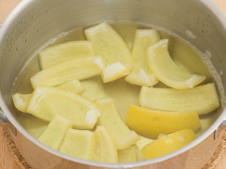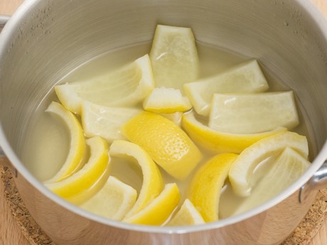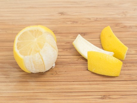 1. Slice off both ends of the lemon and using the tip of a paring knife cut through peel and white pith from top to bottom, making an incision about ½ inch (1 cm) deep. Repeat slicing around fruit so there are about 8 even sections. Gently separate each section from the fruit as though hand peeling an orange. Slice off any excess white pith, leaving about ⅜ inch (5mm) of skin and pith in total.