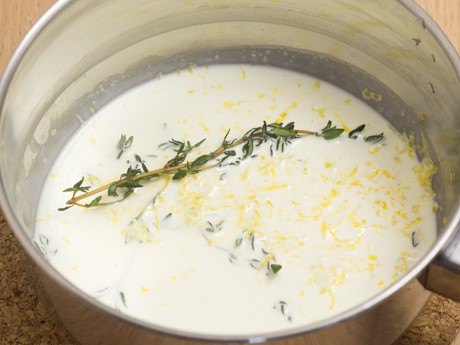 1. Bring the cream, zest and thyme to a simmer in a medium saucepan. Remove from heat, cover and let steep for 30 minutes. Return cream to heat and bring to a boil; immediately pour through a strainer over the chocolate. Let chocolate stand for two minutes, add butter and stir gently until smooth. If mixture begins to separate, add a tablespoon of heavy cream and continue to stir until it comes back together. Stir in the ⅛ inch (3 mm) pieces of candied lemon peel and chill for at least 1 hour.