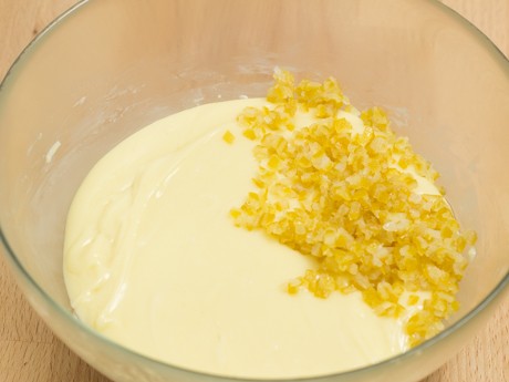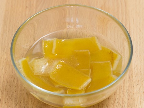 2. Place peel in a small pot and cover with cold water. Bring water to a simmer and cook for 10 minutes. Drain, cover peel with fresh cold water and repeat cooking process. Drain again return to pot, adding Redpath® Granulated Sugar and water; bring to a simmer over medium low heat and cook for 40 minutes; remove peel to a bowl and cool in syrup. Once cooled cut 6 pieces of peel into ⅛ inch (3 mm) pieces and 2 pieces into ½ inch (1.2 cm) long thin strips; set aside.