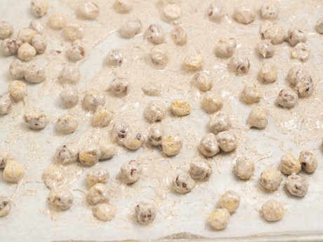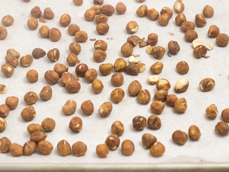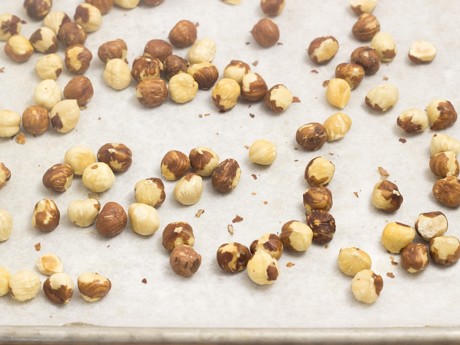 1. Preheat oven to 325℉ (165℃). Lay hazelnuts on a rimmed baking sheet and bake for eight minutes. Place hot nuts in a clean tea towel and rub to remove skins; set aside.
