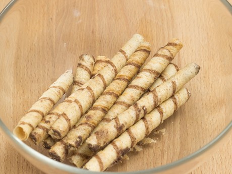 2. Reduce oven temperature to 300℉ (150℃). In a medium bowl whisk together the egg white, Redpath® Granulated Sugar, cinnamon and salt. Stir in hazelnuts any lay out on a greased or parchment lined baking sheet. Bake in oven for 20 minutes, stirring every 5 minutes, until egg mixture is golden and crispy; set aside to cool. Once cooled coarsely chop and combine in a large bowl with the crushed wafer cookies.