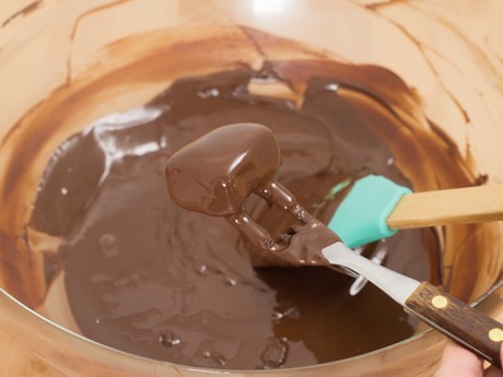 3. Once the cooled temperature is reached gently bring the chocolate back up to the working temperature by placing the bowl over the hot pot of water for about 10 seconds, stirring constantly. Keep placing the bowl on/off the hot pot of water until chocolate reaches the desired temperature (this may happen quickly). Use the chocolate immediately, flashing it over the hot water as necessary to keep it at the working temperature.