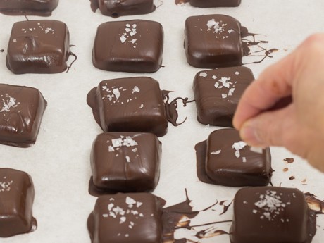 1. Temper dark chocolate according to directions below. Using a fork dip cooled caramel squares into the chocolate, scraping any excess chocolate off on the side of the bowl. Lay on a parchment lined baking sheet and sprinkle with coarse salt and allow to set at room temperature.