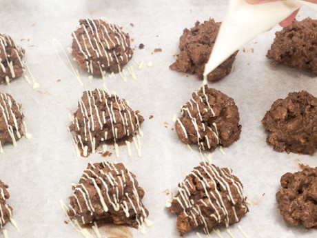 4. To decorate melt the white chocolate in the microwave, stirring every 15 seconds. Place in a small plastic bag and cut a small tip of the corner off; drizzle chocolate over rocher.