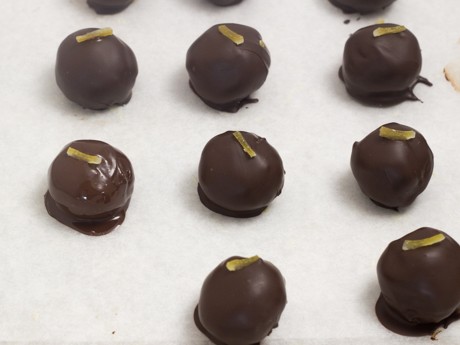1. To coat truffles chocolate temper dark chocolate following the instructions below. Dip ganache ball in chocolate and remove with a fork. Remove excess by pulling bottom of fork along the edge of the bowl of chocolate and gently place a strip of candied peel on top. Allow to set at room temperature.