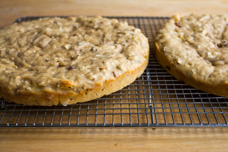 8. Bake for 25-30 minutes on the middle rack until a cake tester inserted in the centre comes out clean. Cool cakes in pan for 10 minutes, then de-pan and let cool fully.