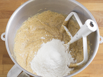 In the bowl of a stand mixer using the paddle attachment, cream together the butter, prune puree, the Redpath® Golden Yellow Sugar, and the Redpath® Granulated Sugar-lemon zest mixture until fluffy and lightened in colour; about 3 minutes.