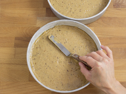 Evenly divide and smooth batter between the 2 prepared cake pans. Place into preheated oven and bake for 27 to 35 minutes, or until a skewer inserted into the centre of each cake comes out clean. Rotate cake pans halfway through the baking process.