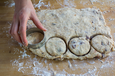 5. Use your hands to pat the dough out to 1.5 inches thick. Using a circular cookie cutter, cut out as many rounds as you can.