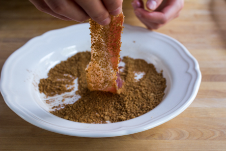 3. Combine cinnamon and brown sugar and spread out on a large plate. Pull bacon slices through the cinnamon sugar until well coated.