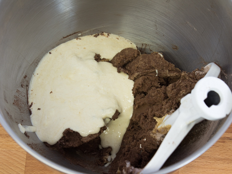 In a medium bowl, whisk together the flour, cocoa powder, instant espresso, baking soda, baking powder, salt and cinnamon.