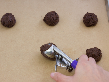 Using a small ice cream scoop (1 ¼ inch / 3 centimetre scoop), scoop equal sized mounds onto the lined baking sheet. Place baking sheet into the fridge to chill slightly; about 10 minutes. Shape chilled mounds into balls before placing into the preheated oven.
